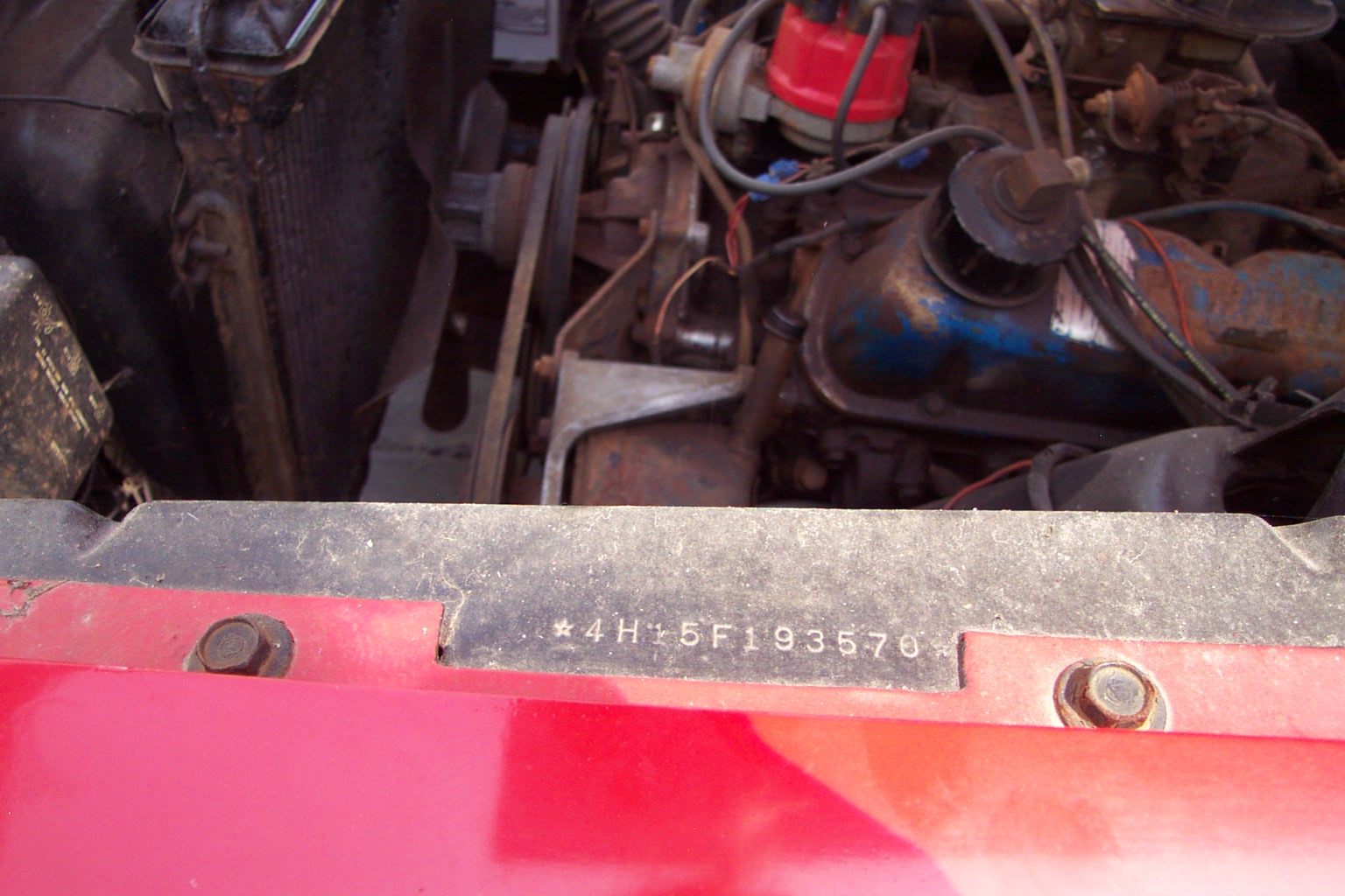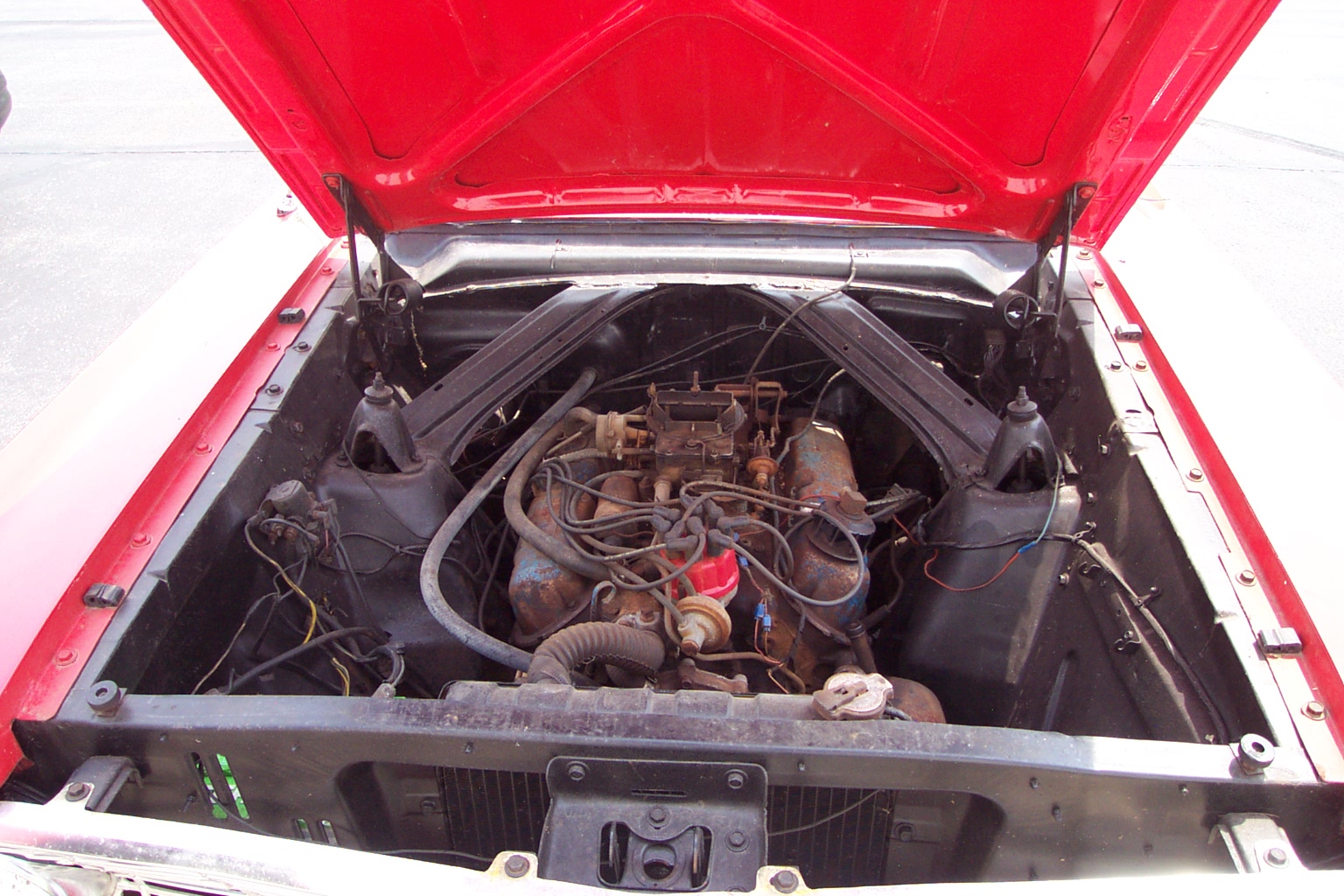 Factory "F" code 260 V8 car with 3 speed manual transmission. Originally Raven Black with red interior, colors now reversed.